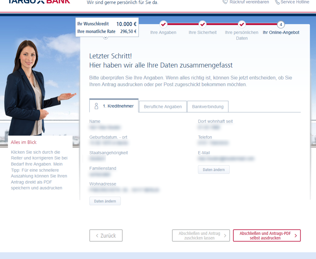 Ein einfaches Verfahren ermöglicht uns, diesen Antrag online oder in einer Filiale einzureichen. Die Targobank informiert uns zügig über die Entscheidung. Falls notwendig, sind weitere Informationen über die finanzielle Situation gefragt.