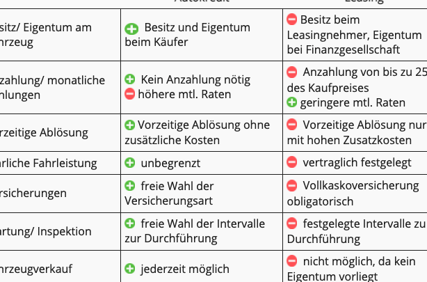 | Kostenfaktor | Leasing | Kredit |