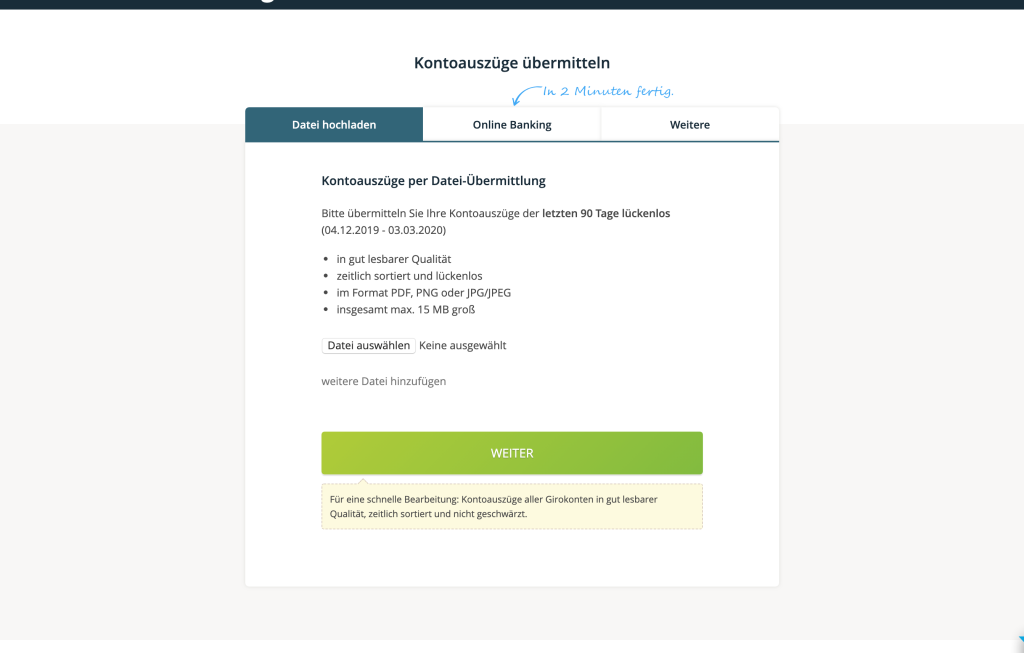 - Einreichung des Antrags: Zuerst fügen wir alle erforderlichen Informationen und Unterlagen in das Online-Formular von Auxmoney ein. Dies umfasst persönliche Daten sowie finanzielle Angaben.