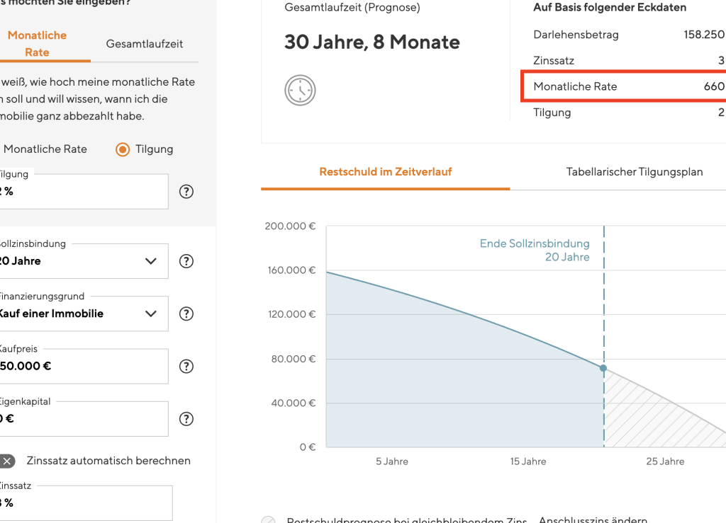 Die Berechnung der monatlichen Rate erfolgt in der Regel mit der Annuitätenformel. Wir können eine exemplarische Berechnung durchführen: